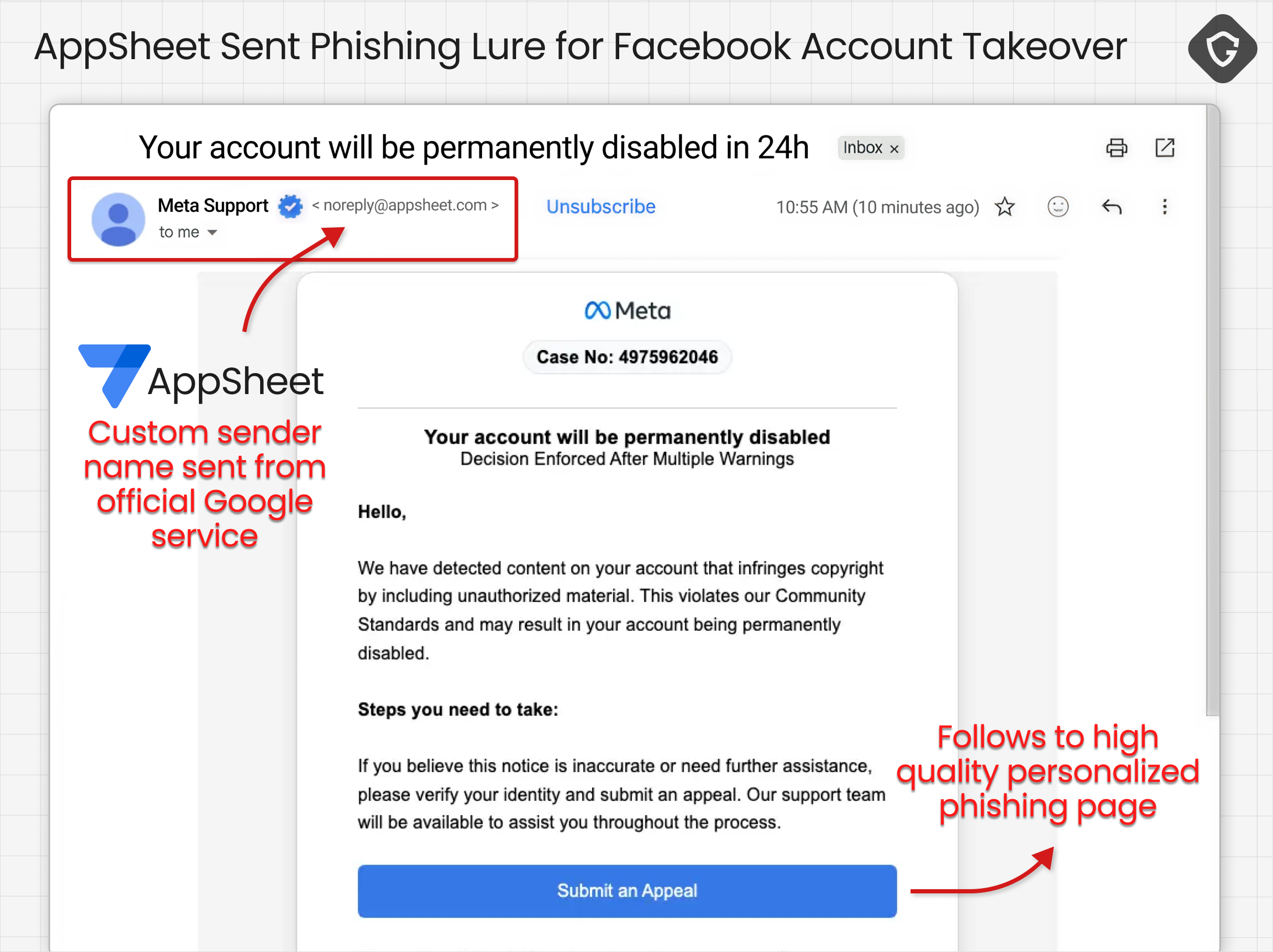 Email phishing used to rely on spoofing, shady SMTP infrastructure, and just enough broken authentication to slip through the cracks. This case starts from the opposite premise: the email is real, the authentication is clean, and the delivery comes through Google’s own AppSheet, the no-code app builder's notification system.