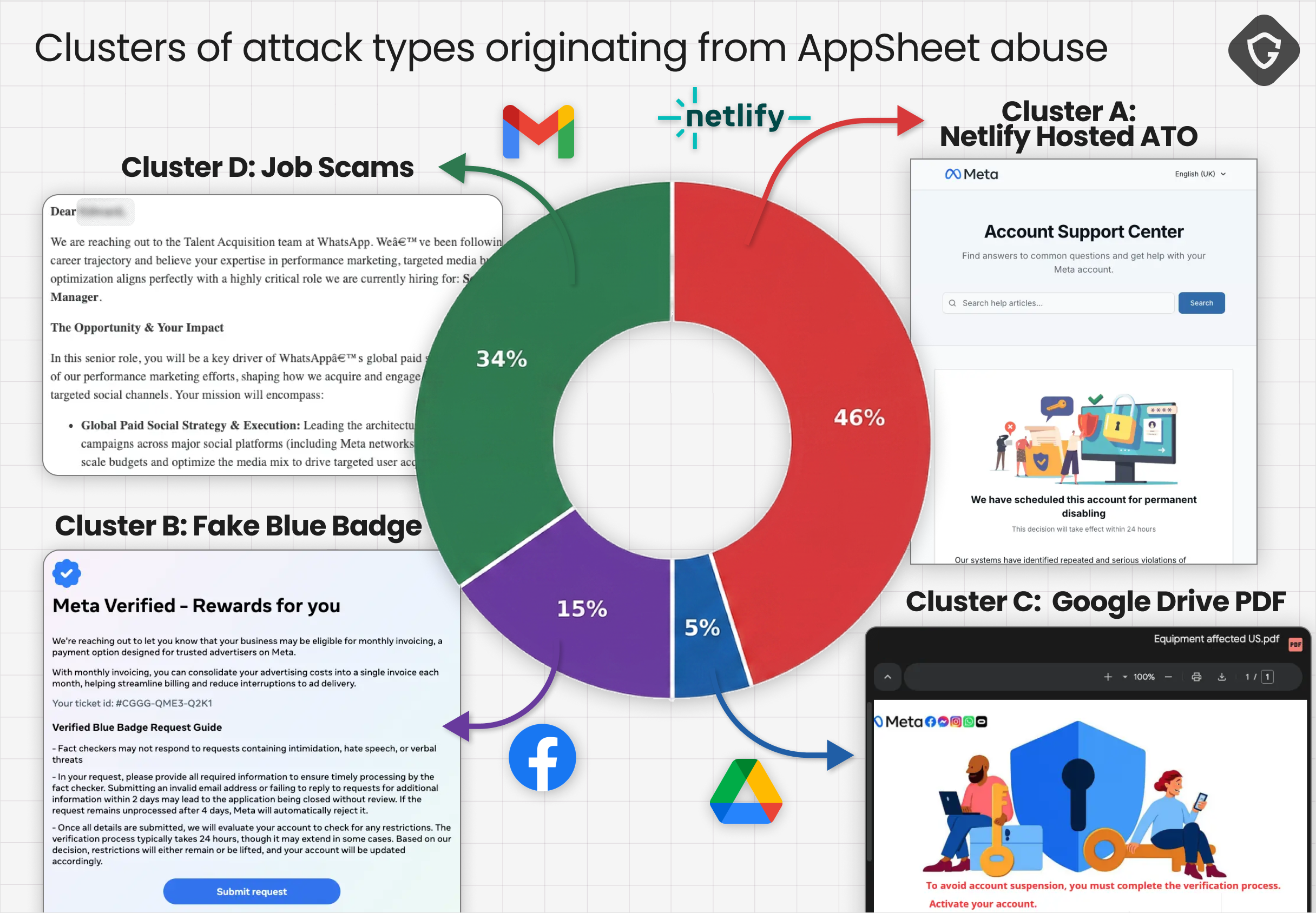 Starting with an examination of the different AppSheet-originated emails by their call-to-action (CTA) targets, four distinct clusters emerged. The narratives shifted, the infrastructure varied, and the evasion techniques evolved, but the target remained consistent: Facebook accounts with real-world value. Are those different attackers with the same tricks? Or just a single attacker doing some dark side of risk management?