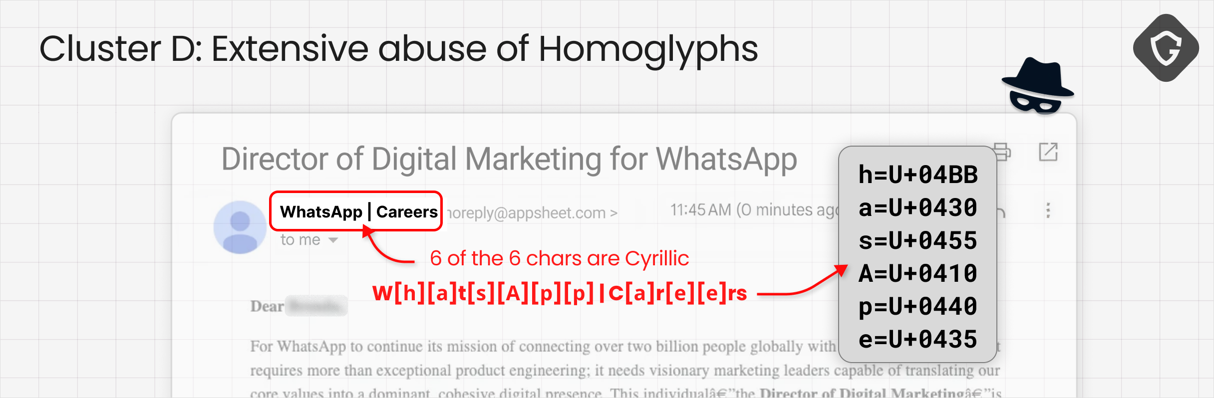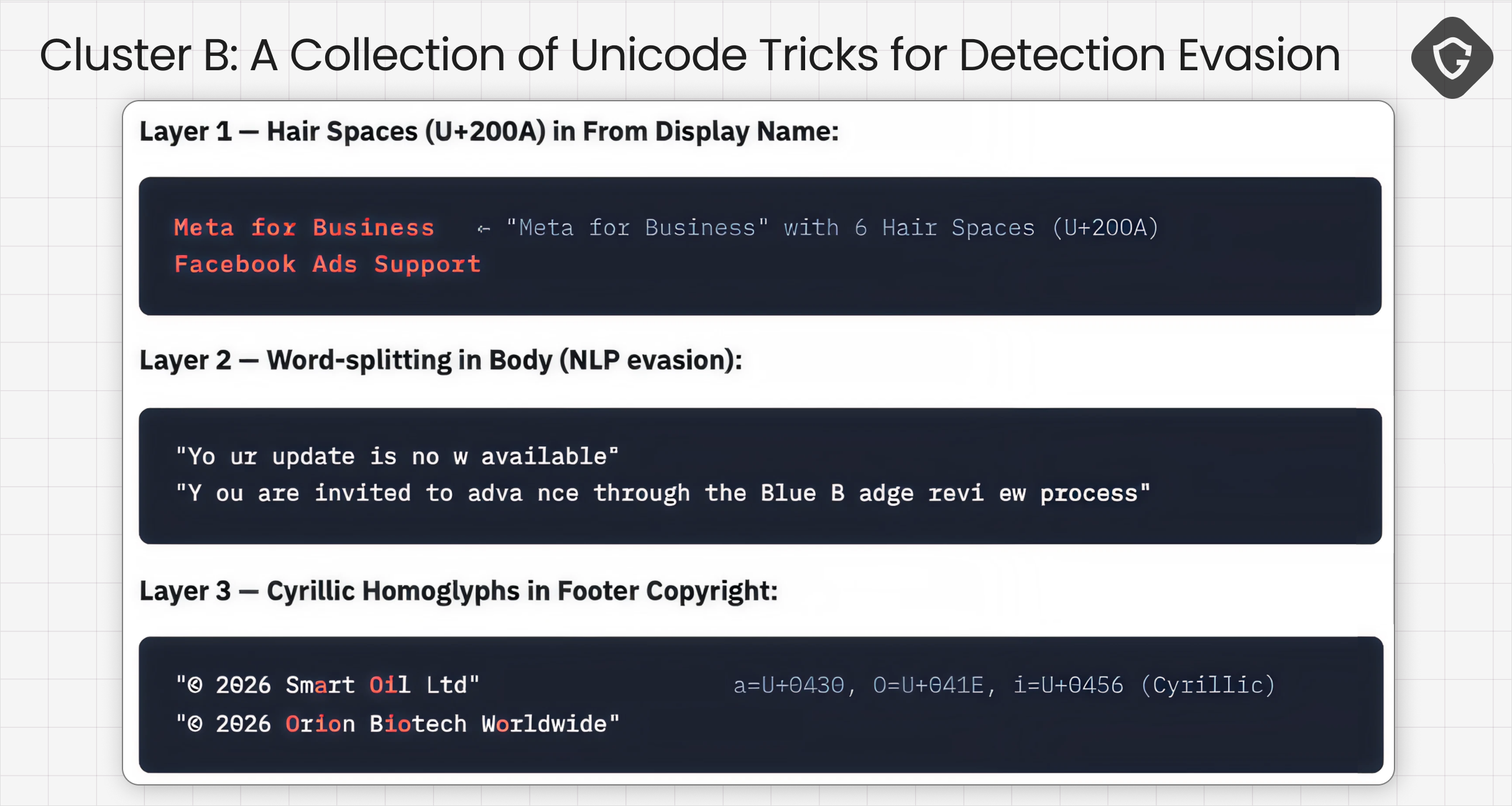 The evasion stack in Cluster B was the most layered we saw at the email stage. Sender display names were padded with invisible hair spaces (unicode invisible character). Body text broke words mid-word to interfere with NLP-based detection. Footer branding used Cyrillic homoglyphs that looked identical to Latin characters.
