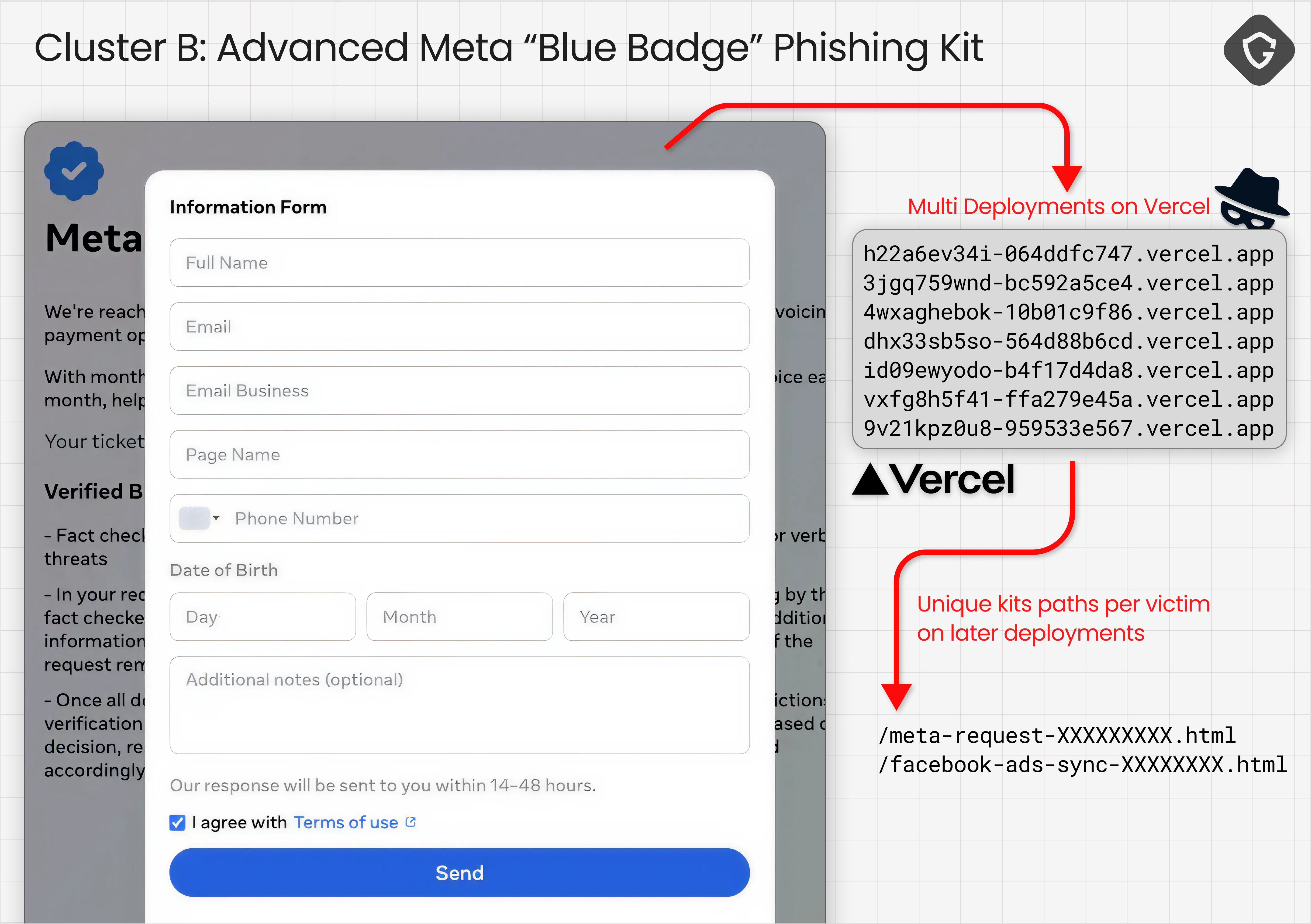 Instead of threatening account loss, these lures offered something desirable: Blue Badge evaluation, advertiser rewards, or opportunities for account verification. The emails read less like warnings and more like invitations, guiding victims toward Vercel-hosted “Security Check” or “Meta | Privacy Center” pages.