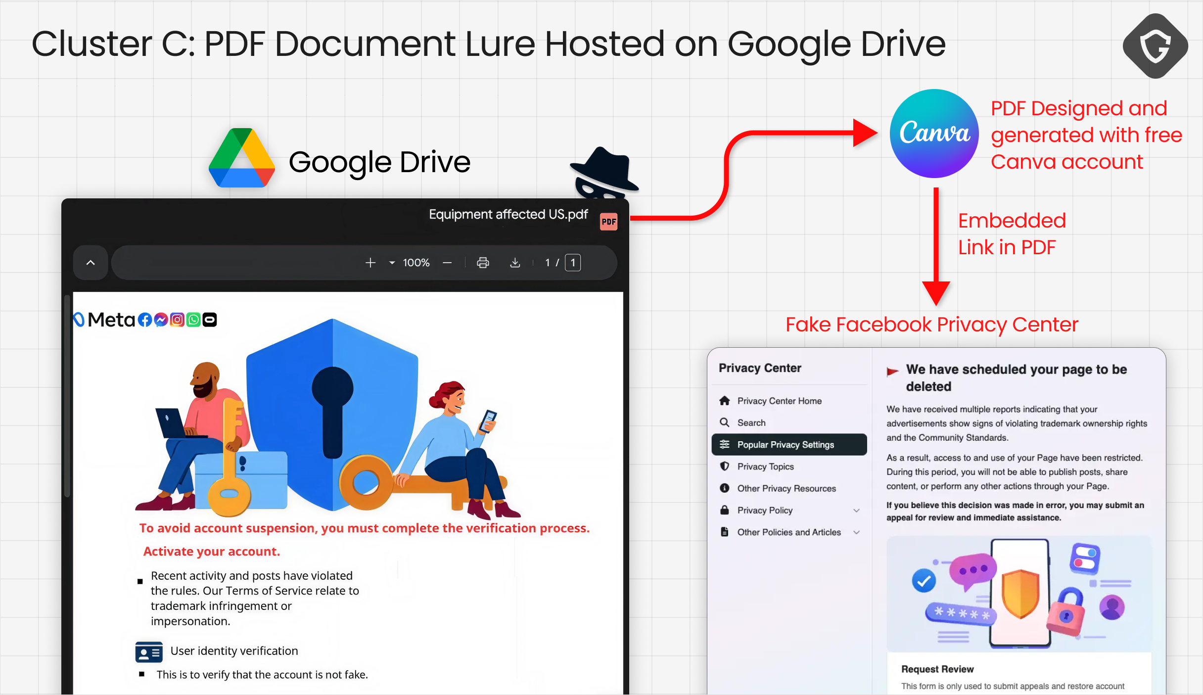 Cluster C was by far the most advanced. At first glance, the email looked familiar. Another business-page warning. Another urgent Meta notice. But the click path didn’t go straight to a phishing page. It went somewhere safer. Or at least, something that looked safer - A Google Drive link.