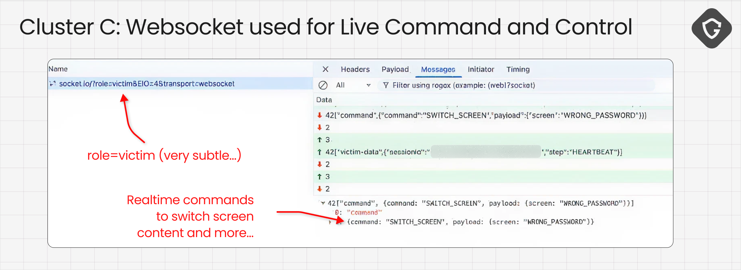 That panel gave the operator something the other clusters didn’t: control. We captured live WebSocket traffic showing session identifiers, screen-switch commands, incorrect-password responses, and state changes moving back and forth between the operator and the victim in real time.