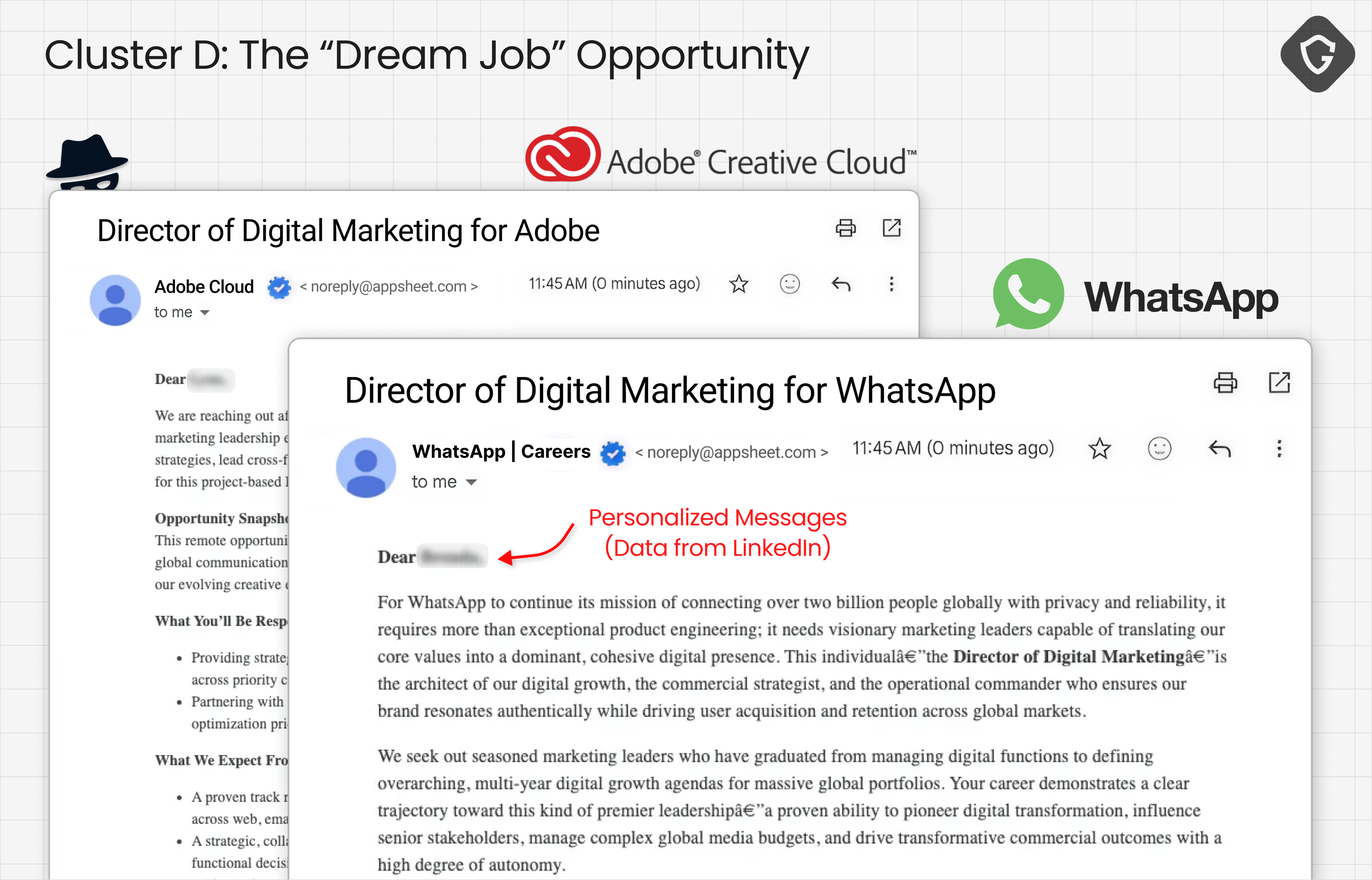 Cluster D appeared simpler, but the underlying play was just as effective. These emails impersonated recruiters from WhatsApp, Meta, Adobe, Pinterest, Apple, Coca-Cola, Threads, and Ray-Ban Meta. The pitch followed a familiar pattern: a personalized outreach, a senior role, and a vague but enticing opportunity. Instead of directing victims to a phishing page, they pushed for a rapid shift into a live interaction, typically asking them to join a call or continue the process off-platform, sometimes through attacker-controlled sites.