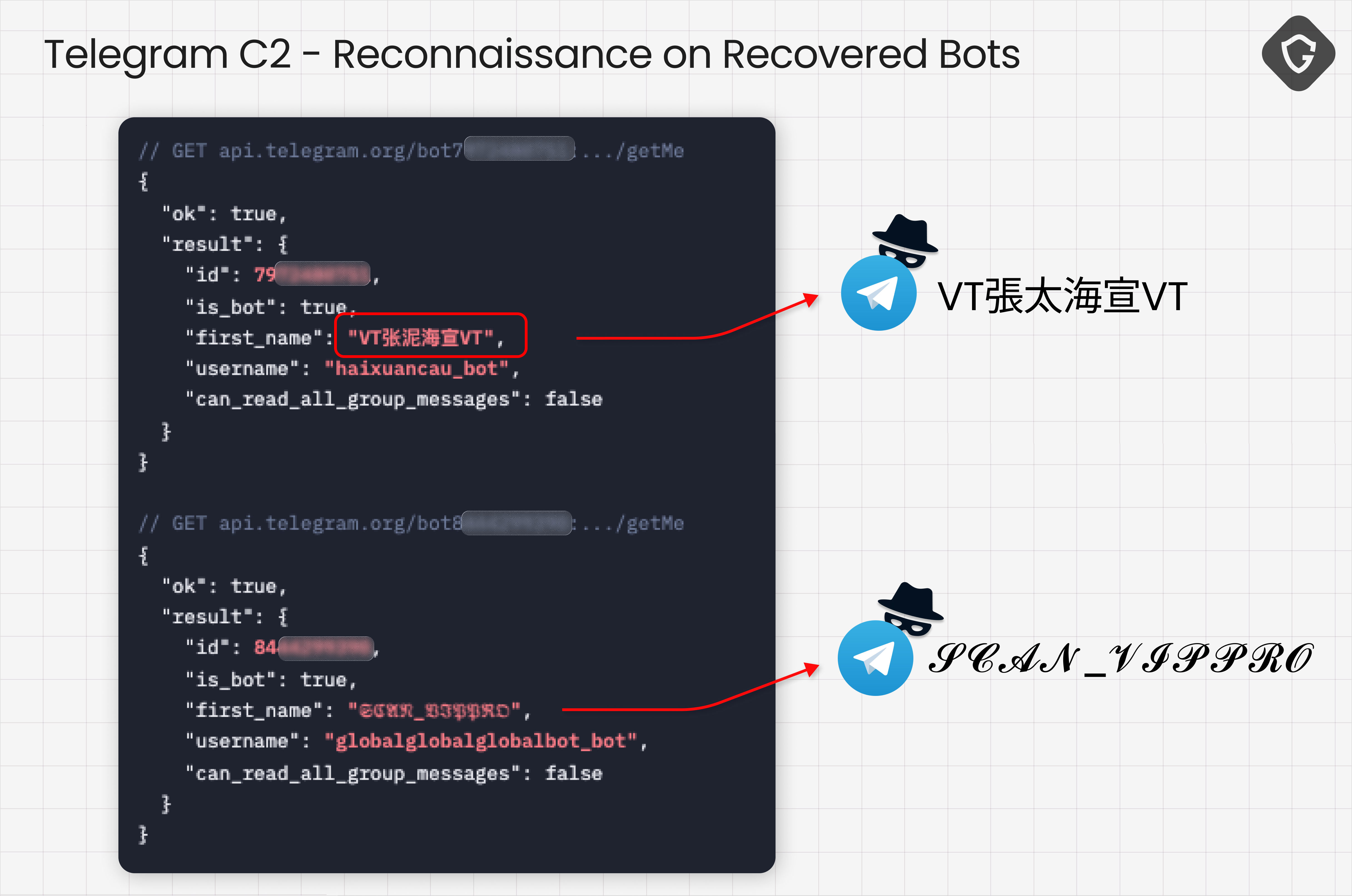 We identified four bots tied to the credential exfiltration pipeline across Clusters A and B, with one already rotated out by the time we reached it. Two of them immediately stood out.
