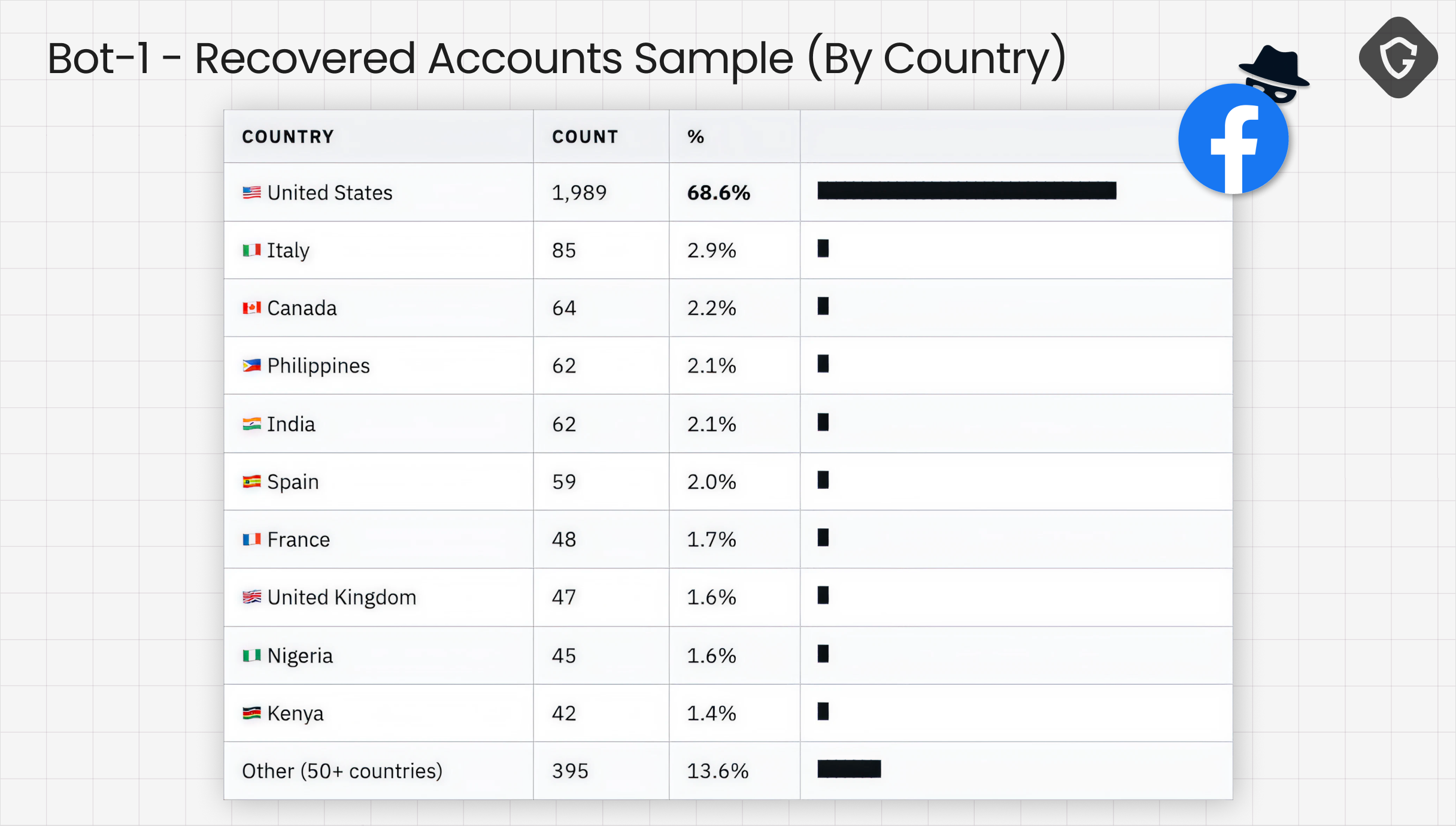 Interestingly, in this case, we were even able to recover more metadata of the hijacked accounts using some advanced tricks. This allowed us to learn more about the geographic distribution of this attack. In the Bot-1 dataset alone, 1,988 of 2,898 victims, or 68.6%, were located in the United States, followed by Italy, Canada, the Philippines, India, Spain, Australia, the UK, Brazil, and Mexico, with more than 50 countries represented overall. The targeting was global, but the primary market was clear.