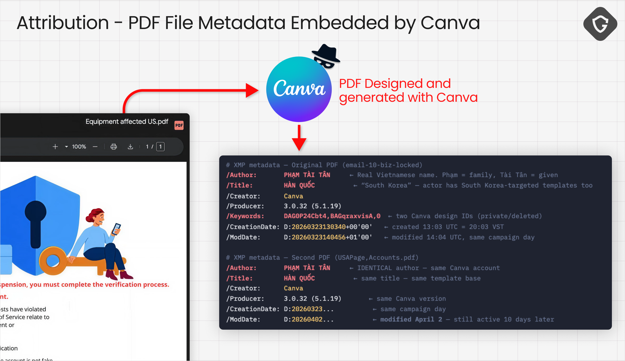 Cluster C’s email links to this PDF on Drive, which looks like just another fake Meta notice until we pulled its metadata. Looks like this is a Canva generated file, which automatically embeds the user account as well as name and attribution to the file! And indeed, the /Author field contained a real Vietnamese name: PHẠM TÀI TÂN