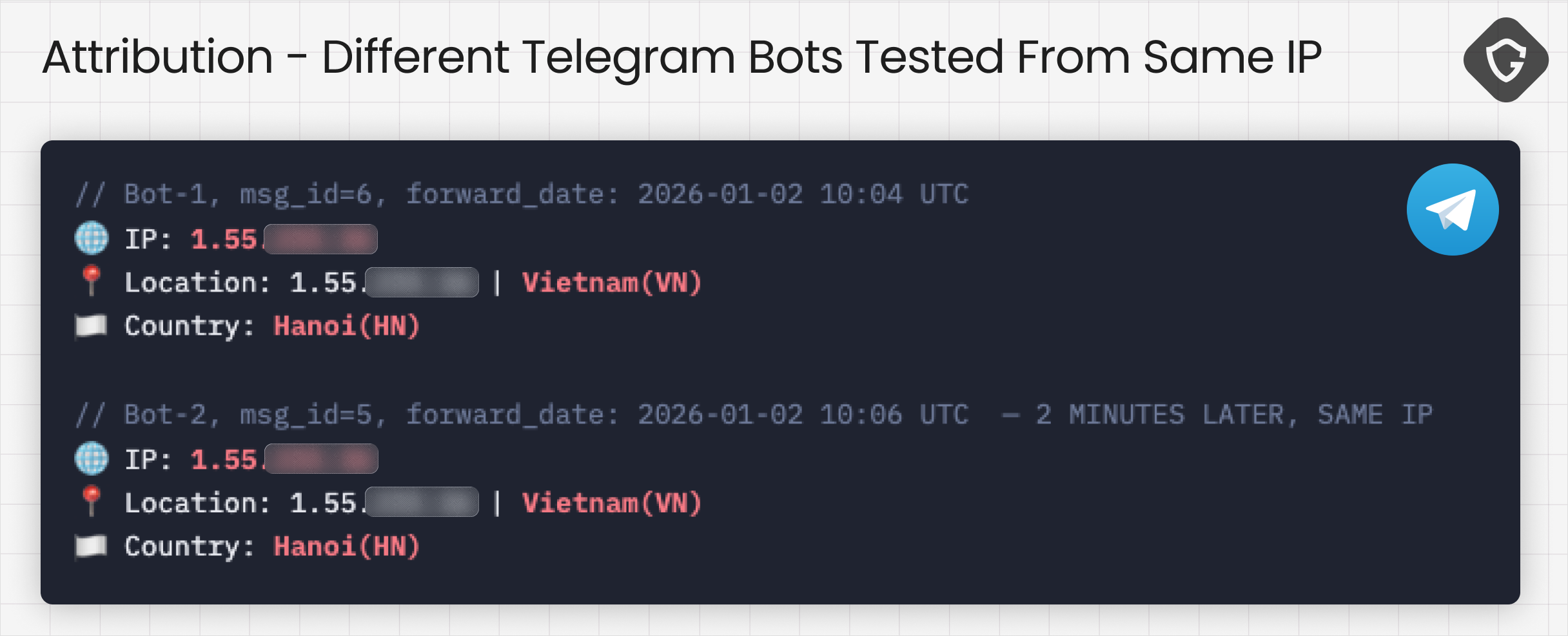 The phishing kits collect credentials and recovery data -> Accounts are taken over -> A public-facing service offers to “recover” access. Taken together, they form a consistent picture of a large, Vietnamese-based, mega operation. Even data recovered from those Telegram Bots across campaign clusters provided clear evidence when initial messages sent with test data (by the Bot creators) provided proof of their origin: