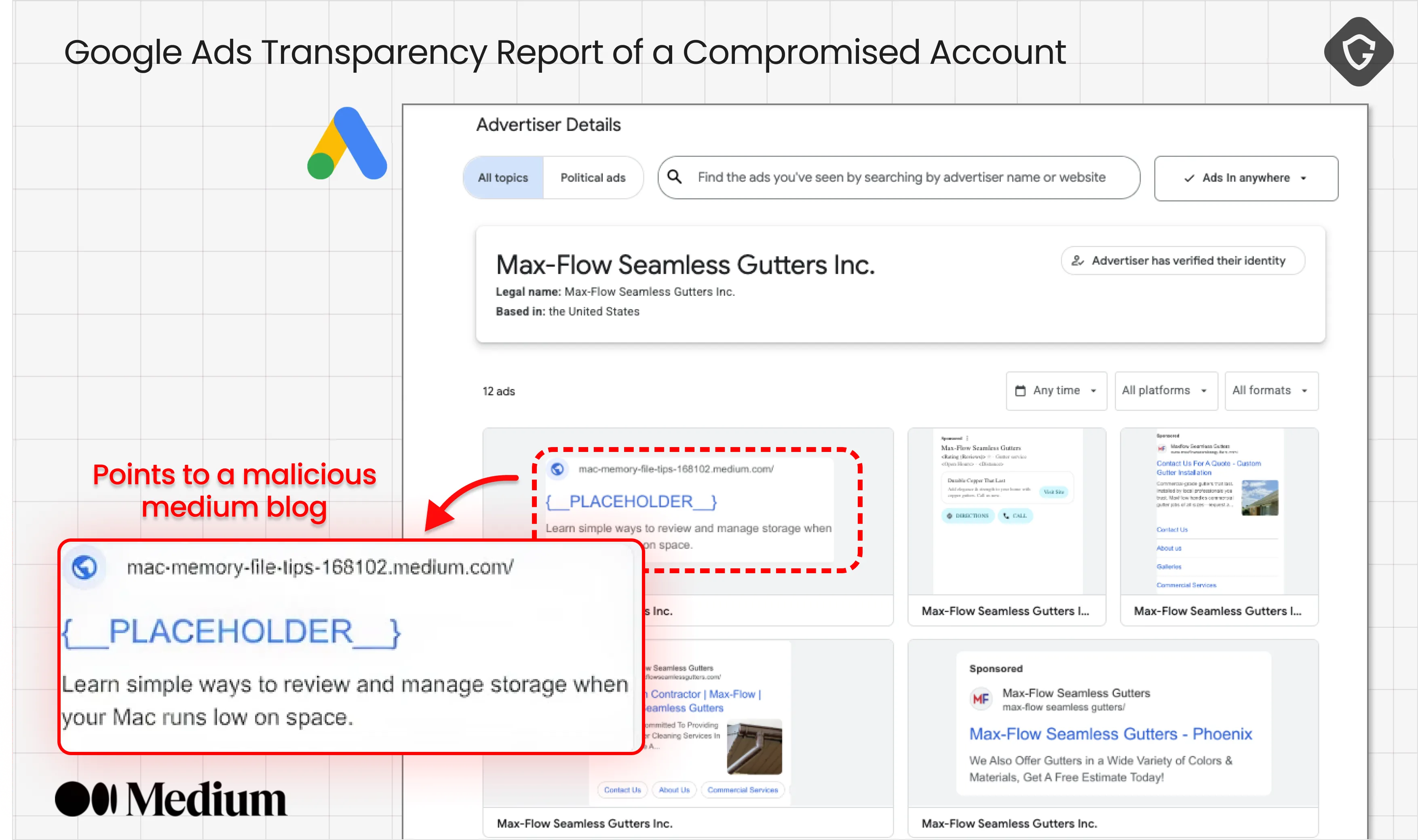 Take, for example, Max-Flow Seamless Gutters Inc. and NFI L.P. Logistics Company, neither of whom have any business offering Mac troubleshooting advice. Their ad accounts, verified by Google, have been quietly subverted to promote sponsored links that redirect to malicious pages on platforms like Kimi or Medium.
